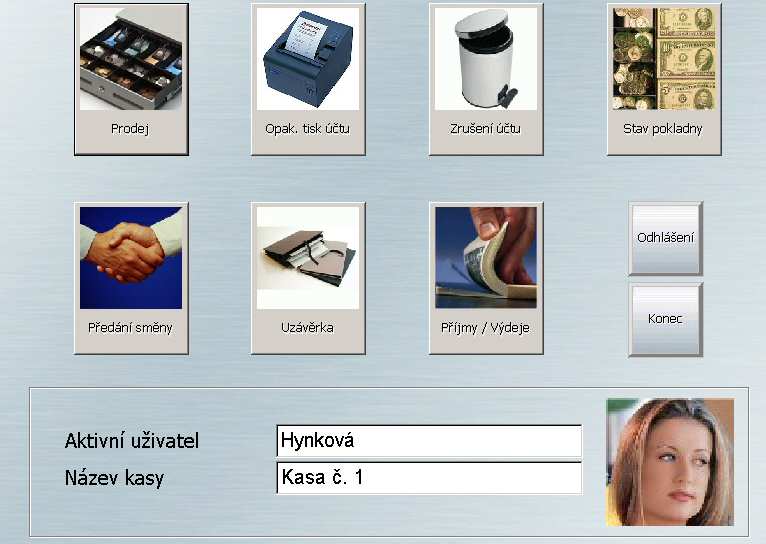 Na obrazovce je znázorněno hlavní menu programu Visual Salon - client, klepnutím myši na vybraná tlačítka vstoupíte do další části programu. Zpět se vrátíte tlačítkem "Konec" v příslušném obrázku.